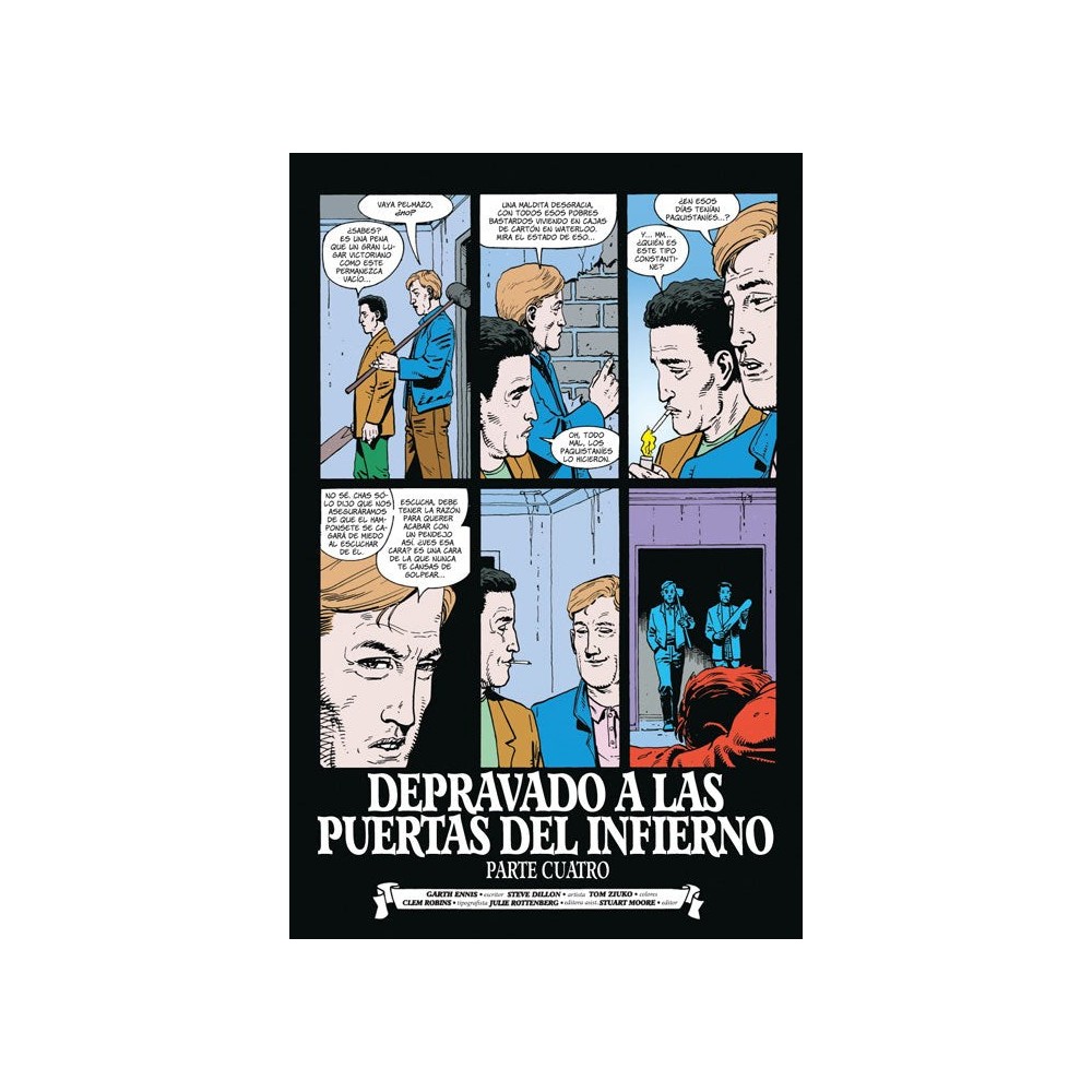 DEPRAVADO A LAS PUERTAS DEL INFIERNO, parte cuatro. Constantine dialoga con un sacerdote, el Primero de los Caídos está en la Tierra y en las calles las clases sociales se exterminan. Por Garth Ennis y Steve Dillon. Portada de Glenn Fabry.