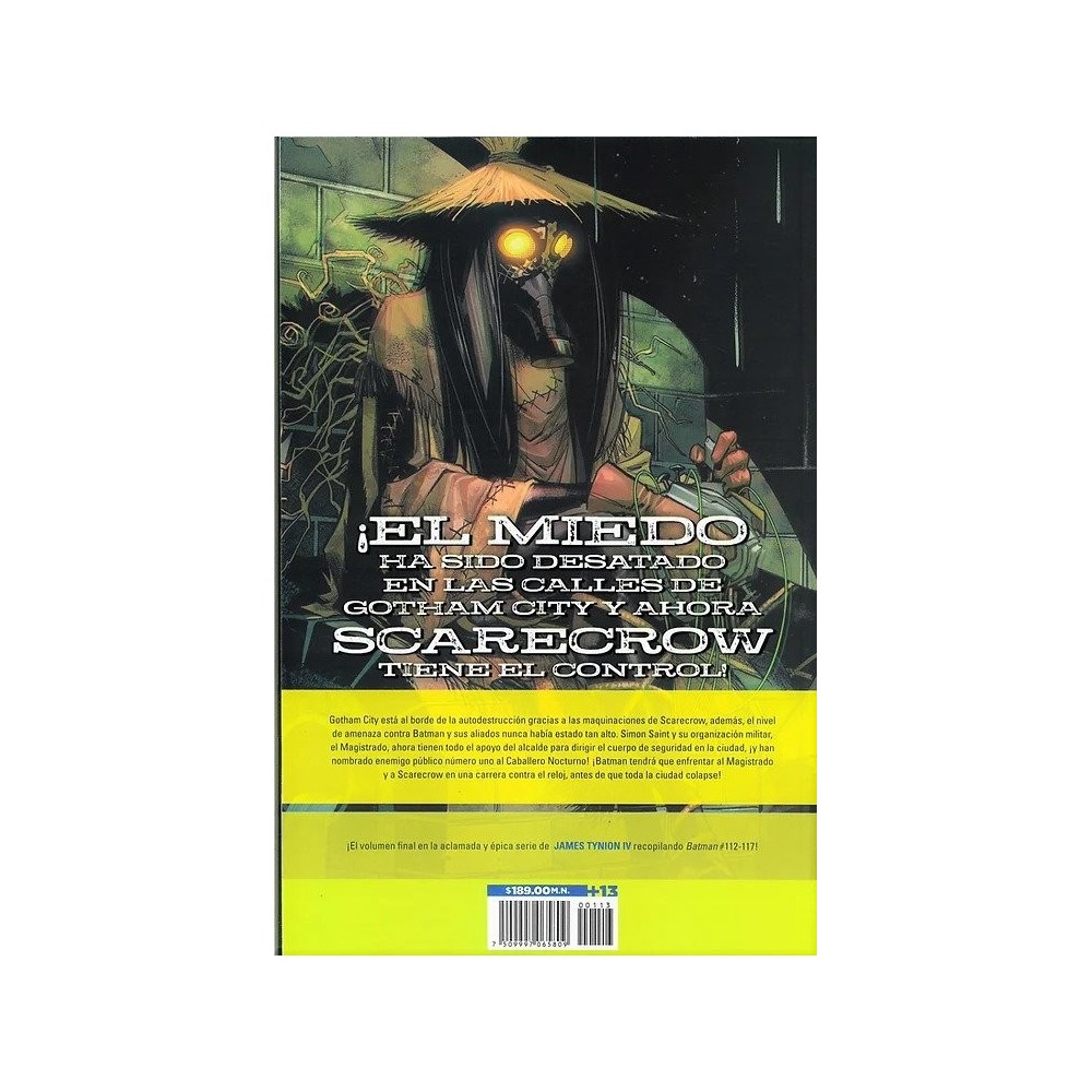EL MIEDO HA SIDO DEATADO EN LAS CALLES DE GOTHAM Y AHORA SCARECROW TIENE EL CONTROL! Gotham City está al borde de la destrucción gracias a las maquinaciones de Scarecrow, además, el novel de amenaza contra Batman y sus aliados nunca había sido tan alto. Simon Saint y su organización militar, el Magistrado, ahora tienen todo el apoyo del alcalde para dirigir el cuerpo de seguridad en la ciudad, ¡y han nombrado enemigo público número uno al Caballero Nocturno! ¡Batman tendrá que enfrentar al magistrado y a Scarecrow en una carrera contra reloj, antes de que toda la ciudad colapse!