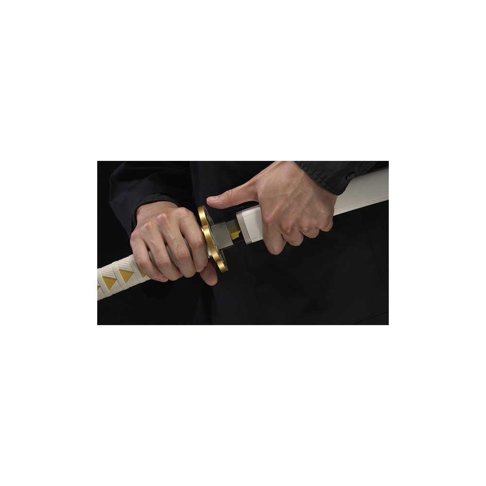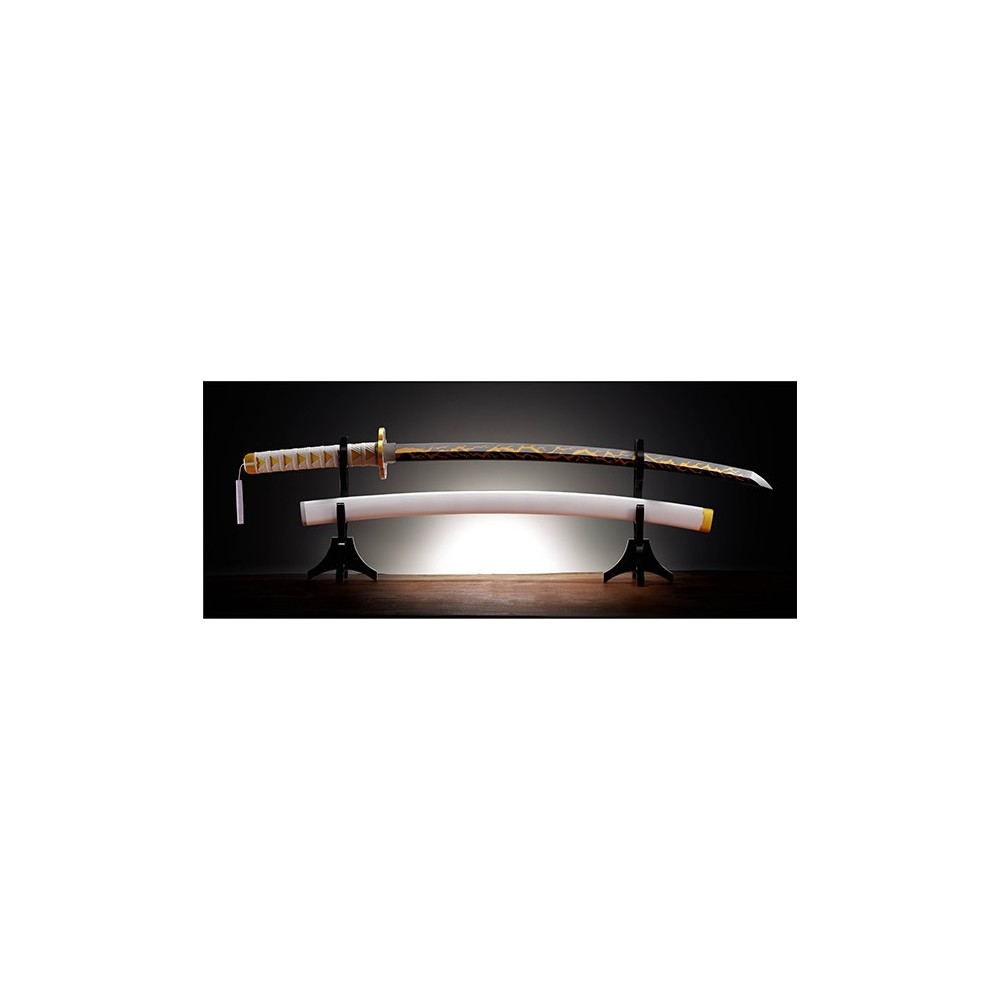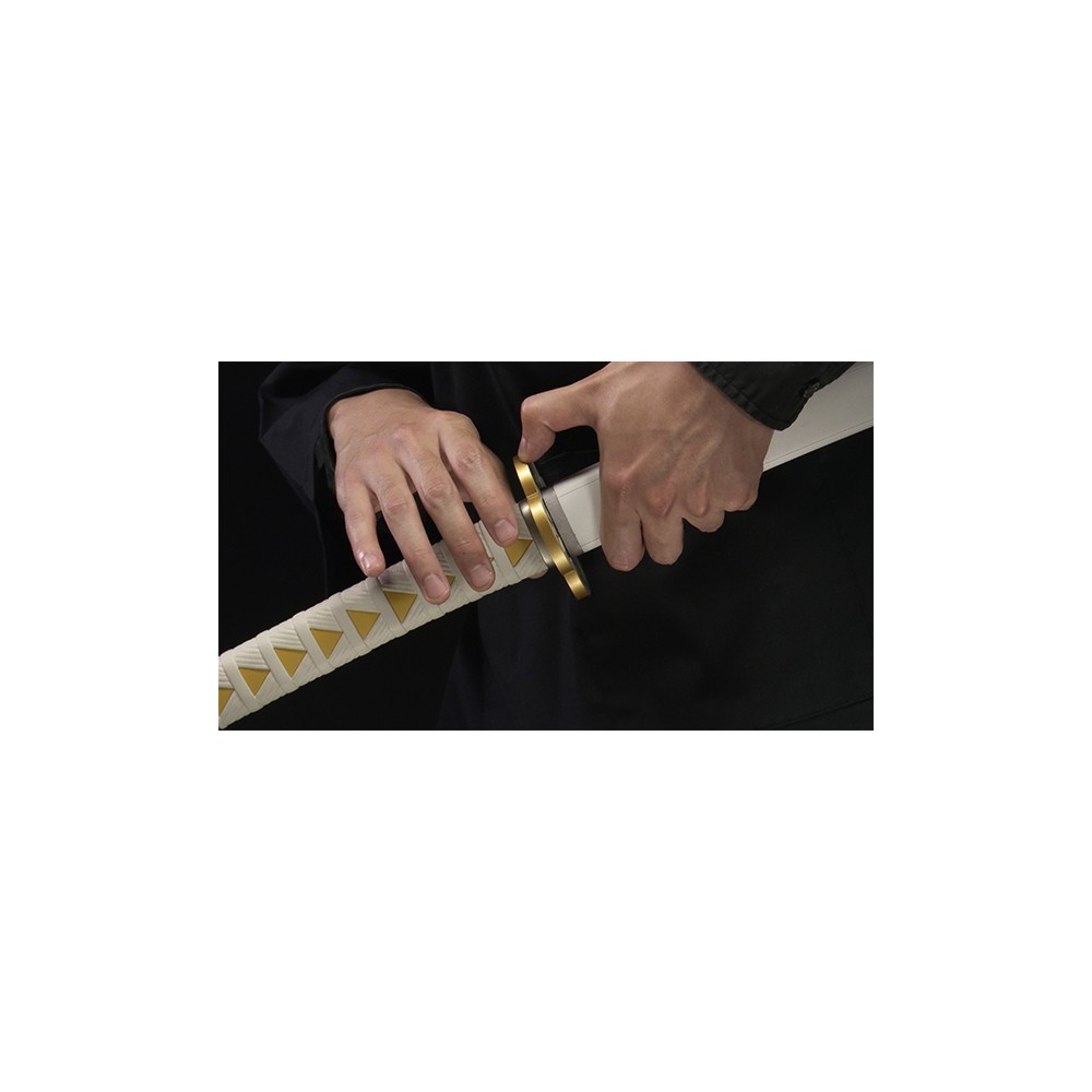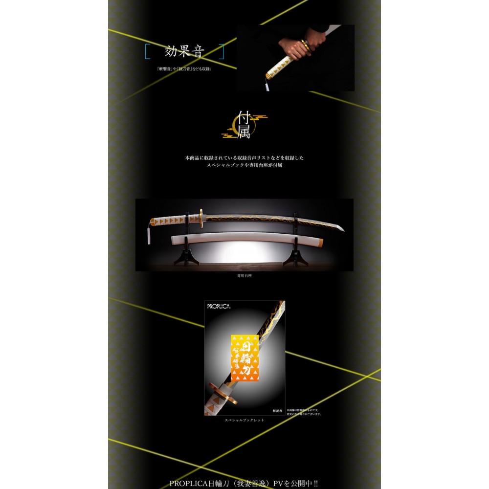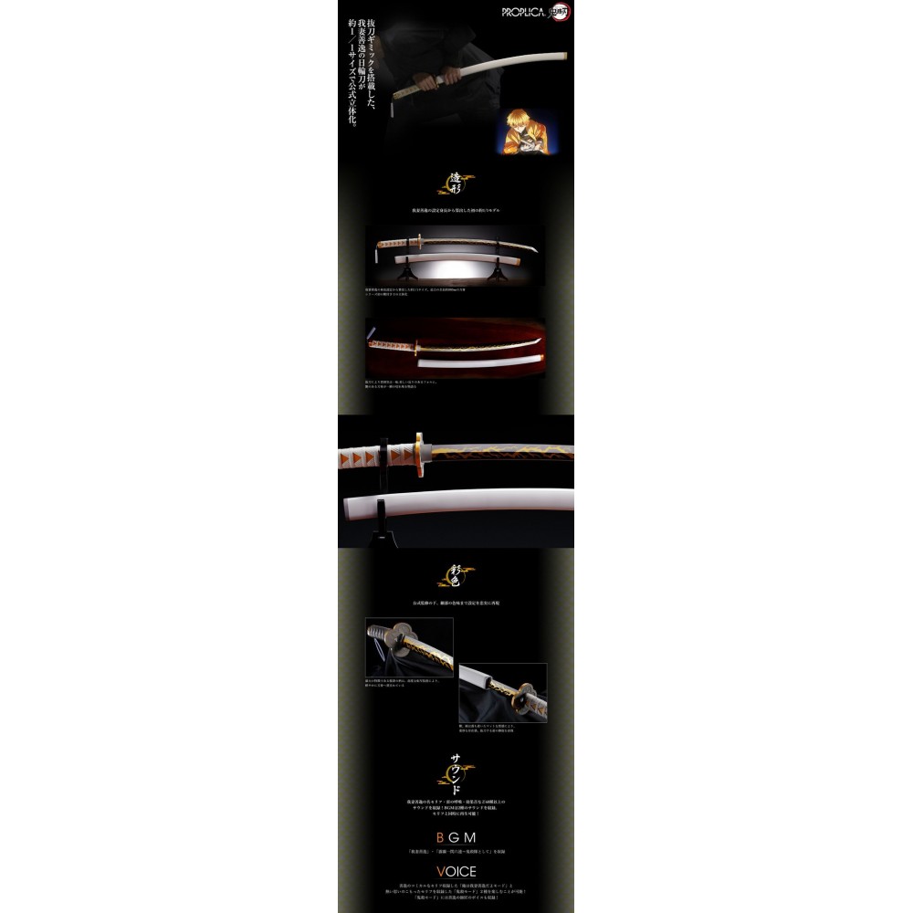 ¡Del éxito mundial "Kimetsu no Yaiba: Demon Slayer", la espada Nichirin de Zenitsu Agatsuma se une a la línea PROPLICA de recreaciones realistas a escala 1/1 de accesorios populares de tu serie favorita! La primer PROPLICA que incluye una vaina, incluye sensores que le permiten replicar las dramáticas escenas de extracción y almacenamiento de la espada de Zenitsu, reproduciendo líneas del anime, efectos de sonido y música de la serie: un total de más de 60 clips de sonido, y con sus 88 cm de longitud de tamaño real. El set incluye la vaina, soporte, y folleto explicativo de la espada Proplica Nichirin.